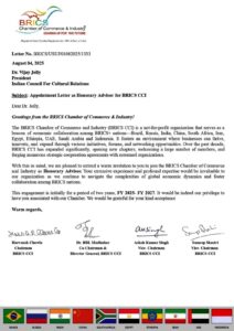 नई दिल्ली, 7 अगस्त 2025: ब्रिक्स चैंबर ऑफ कॉमर्स एंड इंडस्ट्री (ब्राजील, रूस, भारत, चीन व दक्षिण अफ्रीका) ने हाल ही में पूर्व दिल्ली विधायक डॉ. विजय जौली को सम्मानित सलाहकार नियुक्त किया है। चेयरमैन हरवंश चावला, महानिदेशक डॉ. बीबीएल मधुकर, उपाध्यक्ष अशोक कुमार सिंह व समीप शास्त्री के संयुक्त हस्ताक्षर युक्त, सलाहकार नियुक्ति पत्र डॉ. विजय जौली को सौंपा गया। (कॉपी संलग्न है)।